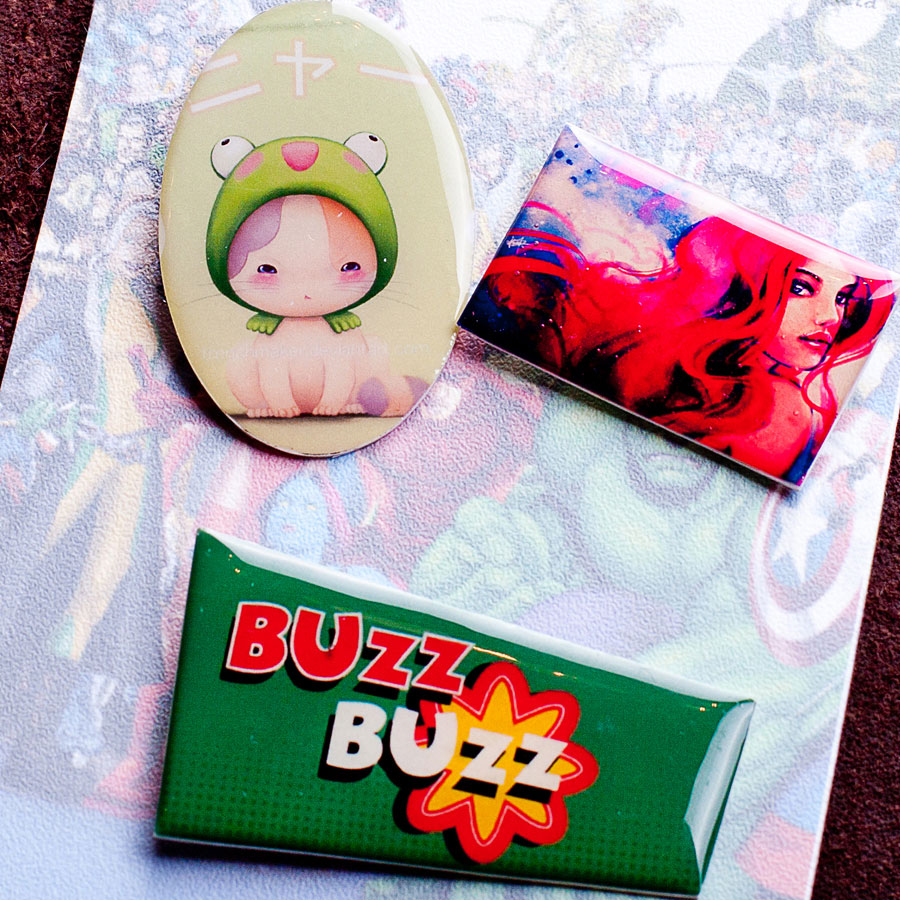 Купить Комплект из 3 брошей в стиле Комикс арт "Лягушонок, рыжая девушка и надпись "BUZZ BUZZ"
